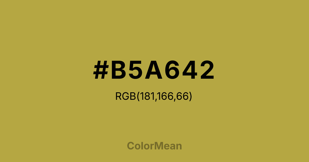 Brass (#B5A642) RGB value is (181, 166, 66). The hex color red value is 181, green is 166, and blue is 66. Its HSL format shows a hue of 52°, saturation of 47%, and lightness of 48%. The CMYK process values are 0%, 8%, 64%, 29%.