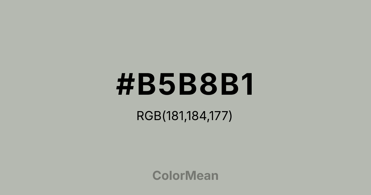 Agate Grey (#B5B8B1) RGB value is (181, 184, 177). The hex color red value is 181, green is 184, and blue is 177. Its HSL format shows a hue of 86°, saturation of 5%, and lightness of 71%. The CMYK process values are 2%, 0%, 4%, 28%.