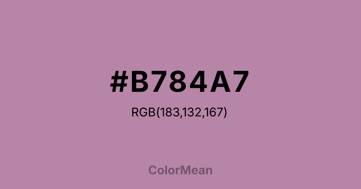 Opera Mauve (#B784A7) RGB value is (183, 132, 167). The hex color red value is 183, green is 132, and blue is 167. Its HSL format shows a hue of 319°, saturation of 26%, and lightness of 62%. The CMYK process values are 0%, 28%, 9%, 28%.