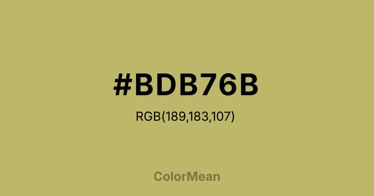 Darkkhaki (#BDB76B) RGB value is (189, 183, 107). The hex color red value is 189, green is 183, and blue is 107. Its HSL format shows a hue of 56°, saturation of 38%, and lightness of 58%. The CMYK process values are 0%, 3%, 43%, 26%.