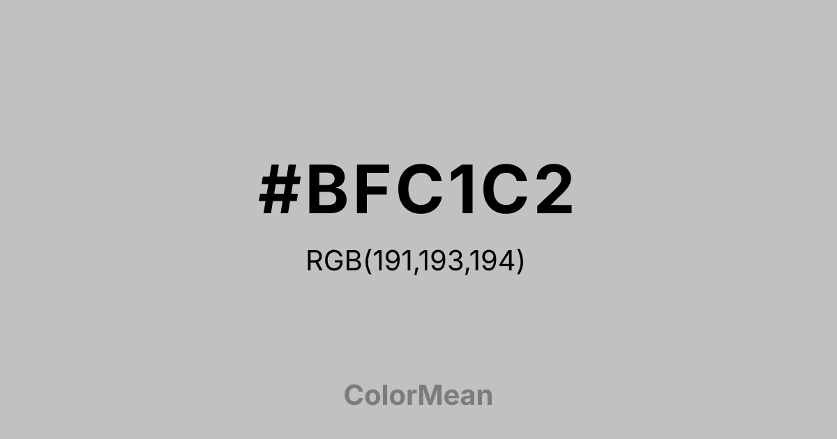 Silver Sand (#BFC1C2) RGB value is (191, 193, 194). The hex color red value is 191, green is 193, and blue is 194. Its HSL format shows a hue of 200°, saturation of 2%, and lightness of 75%. The CMYK process values are 2%, 1%, 0%, 24%.