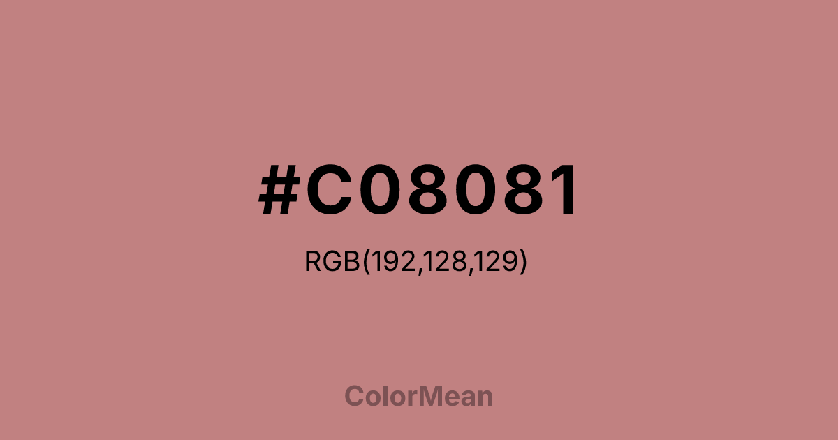 Old Rose (#C08081) RGB value is (192, 128, 129). The hex color red value is 192, green is 128, and blue is 129. Its HSL format shows a hue of 359°, saturation of 34%, and lightness of 63%. The CMYK process values are 0%, 33%, 33%, 25%.