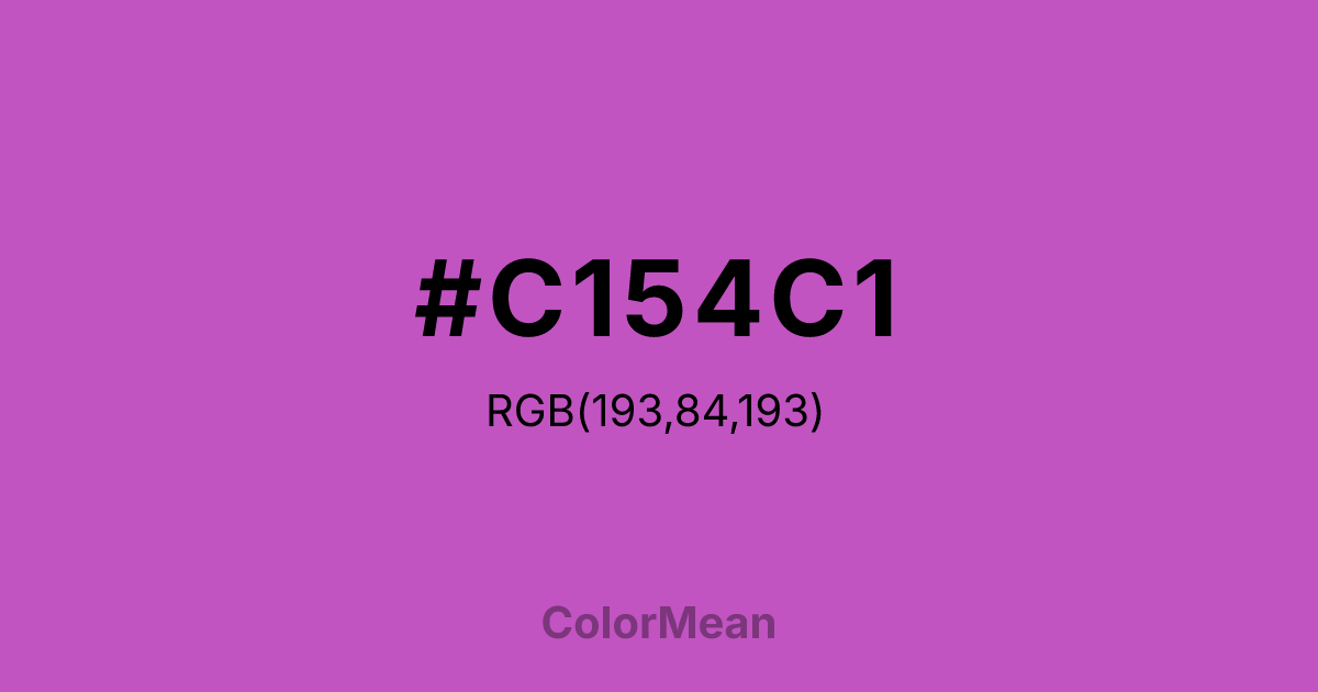 Fuchsia (Crayola) (#C154C1) RGB value is (193, 84, 193). The hex color red value is 193, green is 84, and blue is 193. Its HSL format shows a hue of 300°, saturation of 47%, and lightness of 54%. The CMYK process values are 0%, 56%, 0%, 24%.
