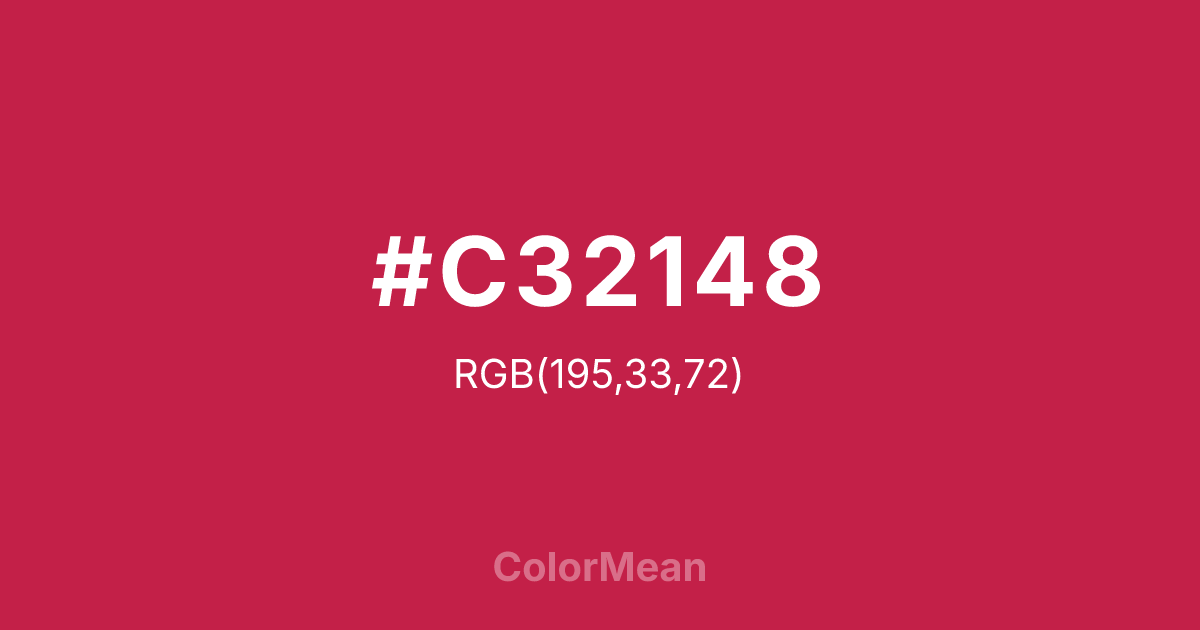 Maroon (Crayola) (#C32148) RGB value is (195, 33, 72). The hex color red value is 195, green is 33, and blue is 72. Its HSL format shows a hue of 346°, saturation of 71%, and lightness of 45%. The CMYK process values are 0%, 83%, 63%, 24%.
