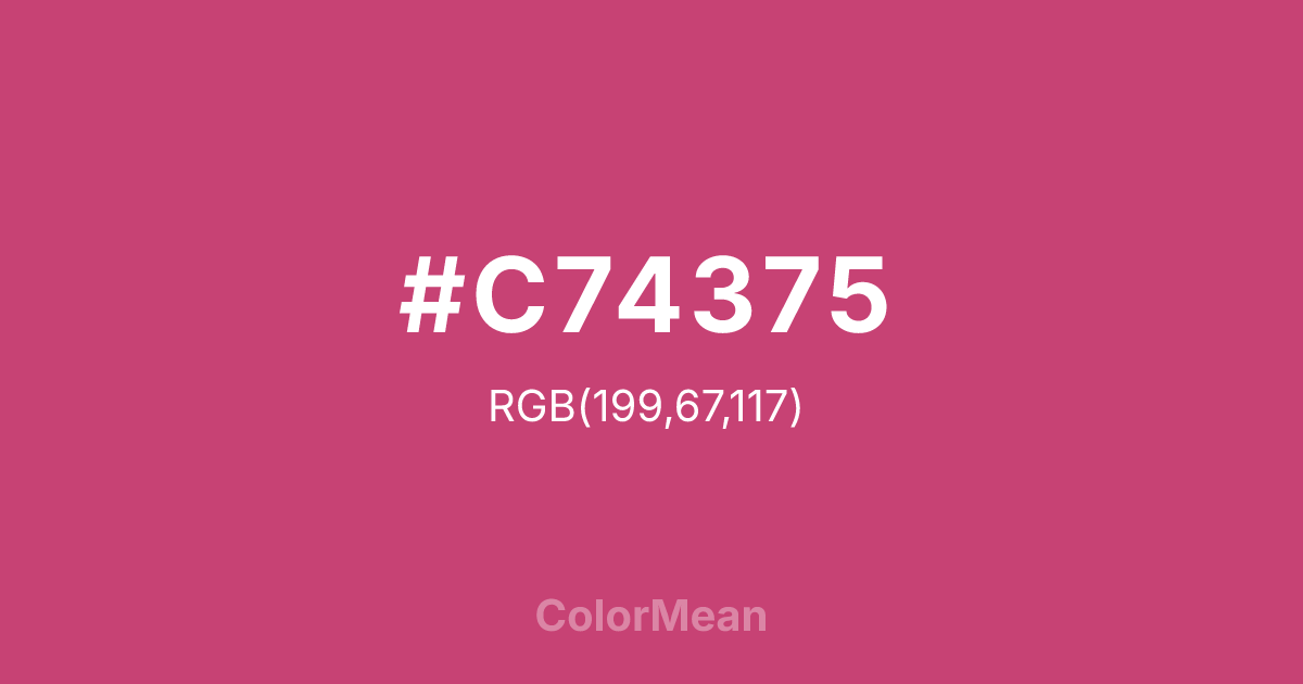 Fuchsia Rose (#C74375) RGB value is (199, 67, 117). The hex color red value is 199, green is 67, and blue is 117. Its HSL format shows a hue of 337°, saturation of 54%, and lightness of 52%. The CMYK process values are 0%, 66%, 41%, 22%.