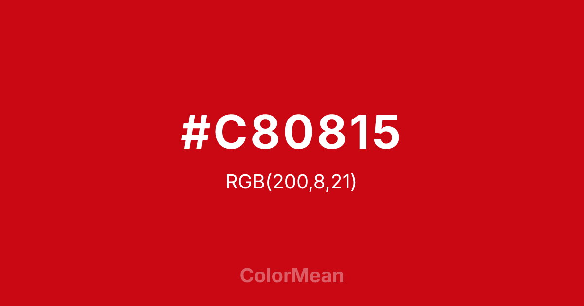 Venetian Red (#C80815) RGB value is (200, 8, 21). The hex color red value is 200, green is 8, and blue is 21. Its HSL format shows a hue of 356°, saturation of 92%, and lightness of 41%. The CMYK process values are 0%, 96%, 89%, 22%.