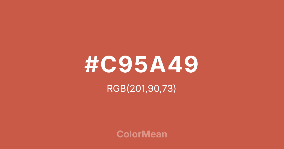 Cedar Chest (#C95A49) RGB value is (201, 90, 73). The hex color red value is 201, green is 90, and blue is 73. Its HSL format shows a hue of 8°, saturation of 54%, and lightness of 54%. The CMYK process values are 0%, 55%, 64%, 21%.