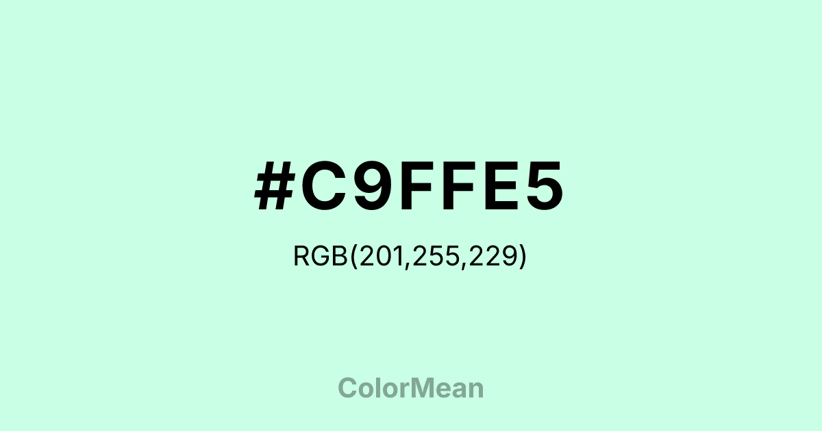 Aero Blue (#C9FFE5) RGB value is (201, 255, 229). The hex color red value is 201, green is 255, and blue is 229. Its HSL format shows a hue of 151°, saturation of 100%, and lightness of 89%. The CMYK process values are 21%, 0%, 10%, 0%.