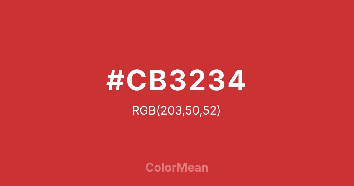 Pure Red (#CB3234) RGB value is (203, 50, 52). The hex color red value is 203, green is 50, and blue is 52. Its HSL format shows a hue of 359°, saturation of 60%, and lightness of 50%. The CMYK process values are 0%, 75%, 74%, 20%.