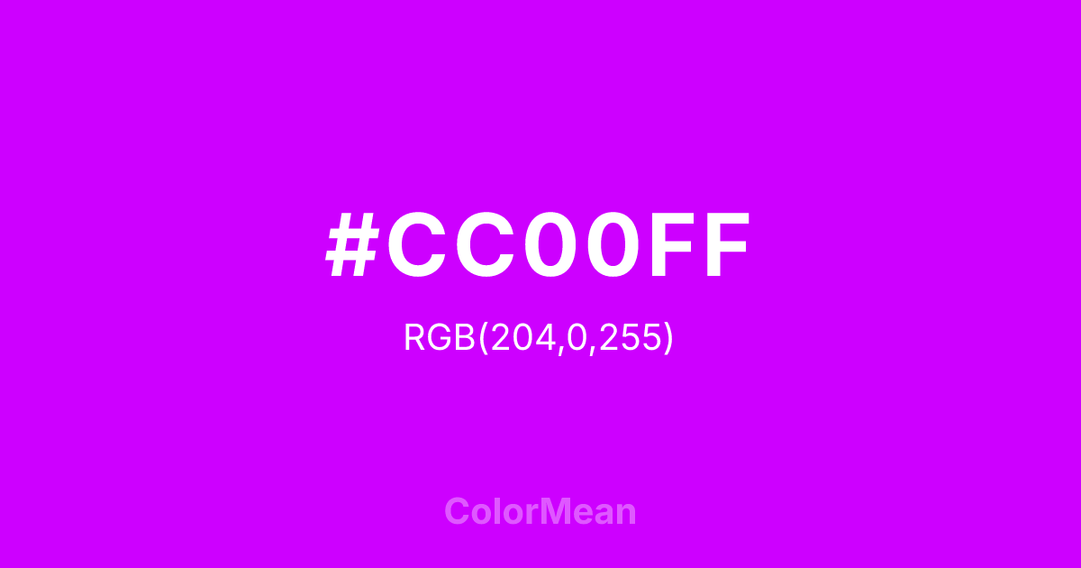 Vivid Orchid (#CC00FF) RGB value is (204, 0, 255). The hex color red value is 204, green is 0, and blue is 255. Its HSL format shows a hue of 288°, saturation of 100%, and lightness of 50%. The CMYK process values are 20%, 100%, 0%, 0%.