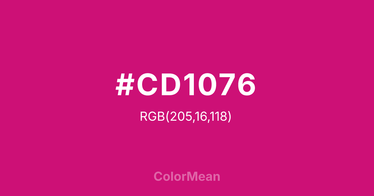 DeepPink3 (#CD1076) RGB value is (205, 16, 118). The hex color red value is 205, green is 16, and blue is 118. Its HSL format shows a hue of 328°, saturation of 86%, and lightness of 43%. The CMYK process values are 0%, 92%, 42%, 20%.