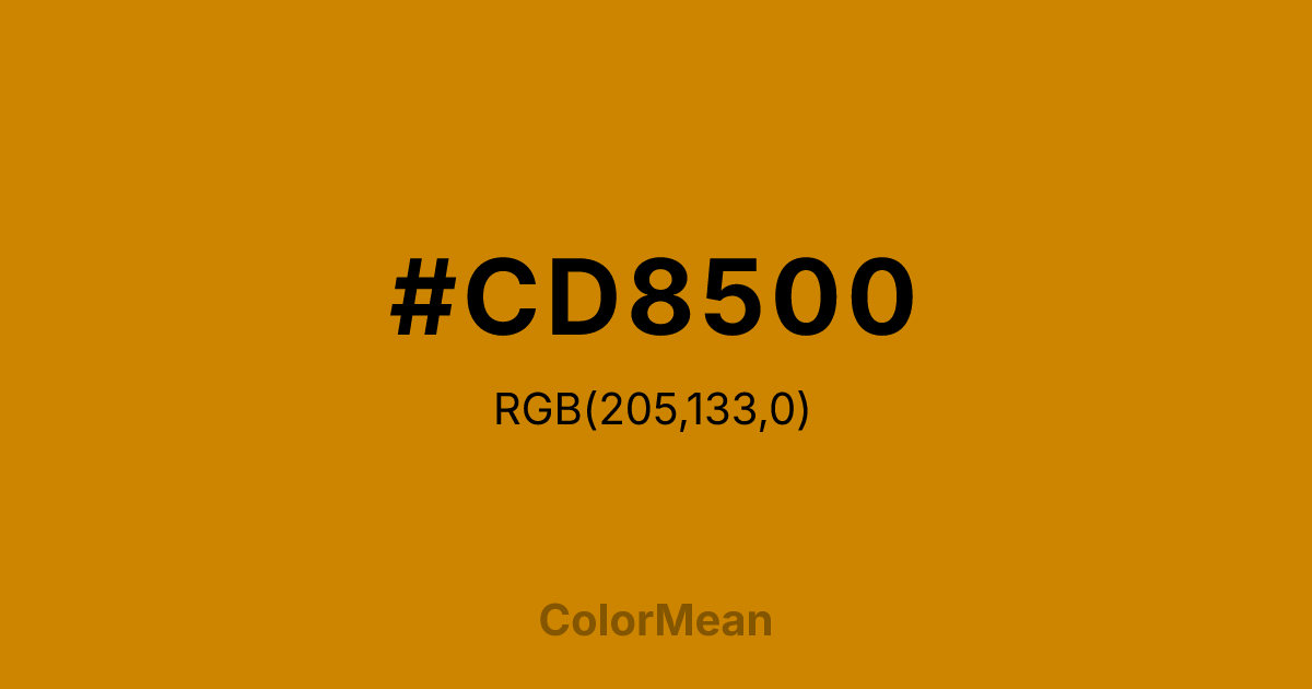 Orange3 (#CD8500) RGB value is (205, 133, 0). The hex color red value is 205, green is 133, and blue is 0. Its HSL format shows a hue of 39°, saturation of 100%, and lightness of 40%. The CMYK process values are 0%, 35%, 100%, 20%.