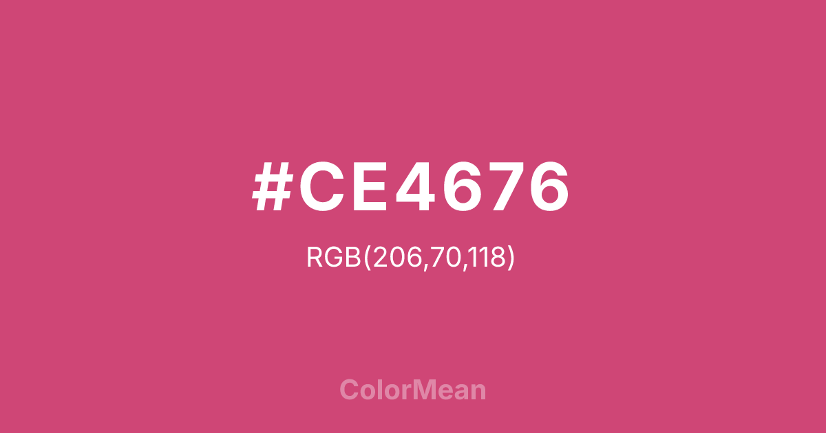Convert Ruber (#CE4676) across different color models and formats. These conversions help designers work seamlessly between digital and print media, ensuring this color maintains its intended appearance across RGB screens, CMYK printers, and HSL color manipulations.