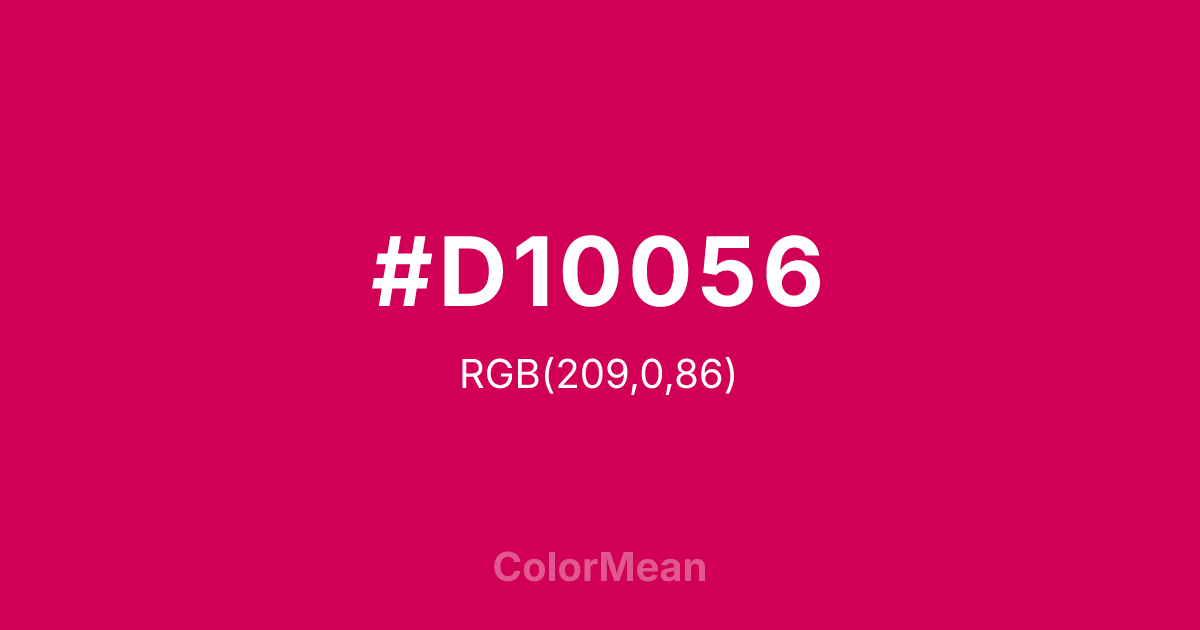 Rubine Red (#D10056) RGB value is (209, 0, 86). The hex color red value is 209, green is 0, and blue is 86. Its HSL format shows a hue of 335°, saturation of 100%, and lightness of 41%. The CMYK process values are 0%, 100%, 59%, 18%.