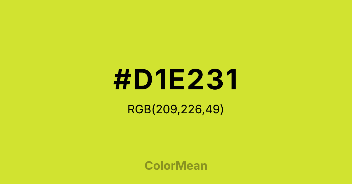 Pear (#D1E231) RGB value is (209, 226, 49). The hex color red value is 209, green is 226, and blue is 49. Its HSL format shows a hue of 66°, saturation of 75%, and lightness of 54%. The CMYK process values are 8%, 0%, 78%, 11%.