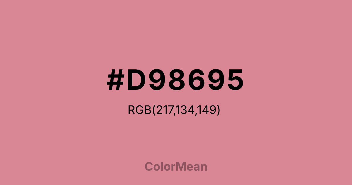 Shimmering Blush (#D98695) RGB value is (217, 134, 149). The hex color red value is 217, green is 134, and blue is 149. Its HSL format shows a hue of 349°, saturation of 52%, and lightness of 69%. The CMYK process values are 0%, 38%, 31%, 15%.