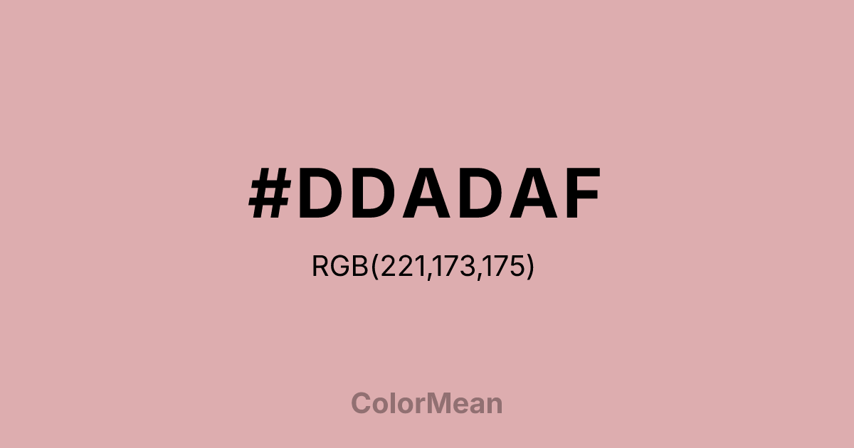 Pale Chestnut (#DDADAF) RGB value is (221, 173, 175). The hex color red value is 221, green is 173, and blue is 175. Its HSL format shows a hue of 358°, saturation of 41%, and lightness of 77%. The CMYK process values are 0%, 22%, 21%, 13%.