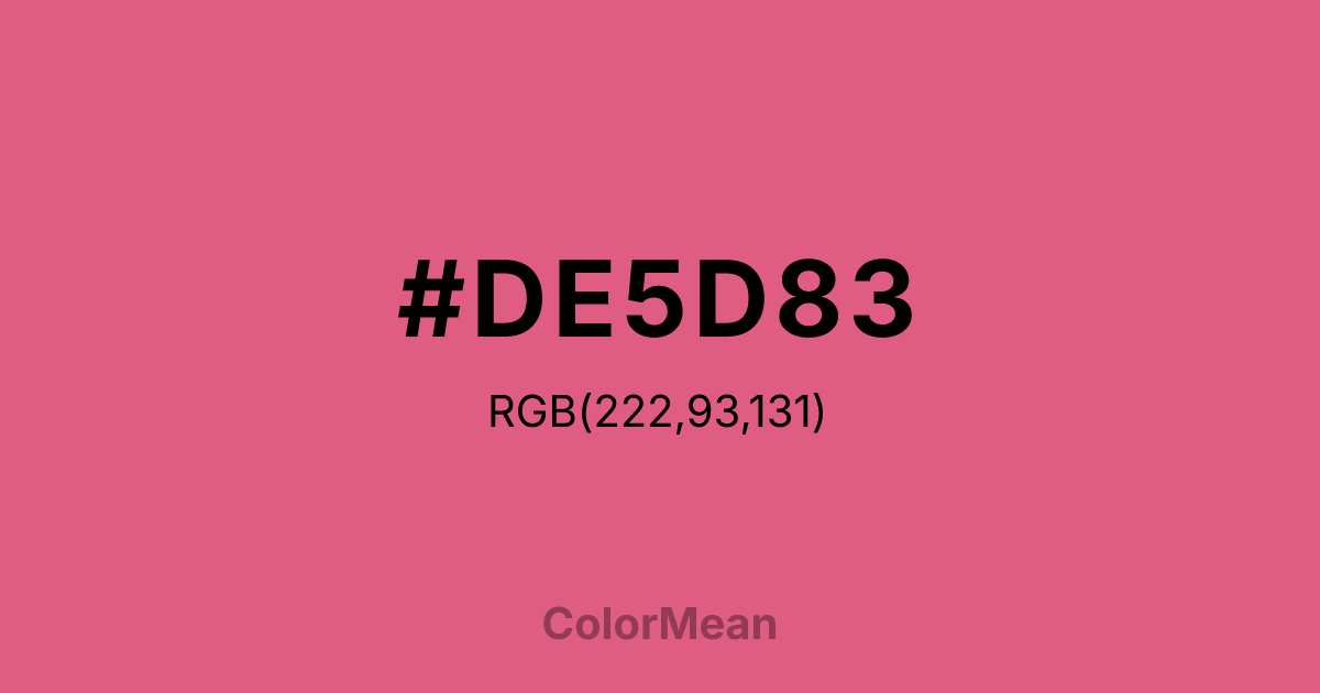 Blush (#DE5D83) RGB value is (222, 93, 131). The hex color red value is 222, green is 93, and blue is 131. Its HSL format shows a hue of 342°, saturation of 66%, and lightness of 62%. The CMYK process values are 0%, 58%, 41%, 13%.