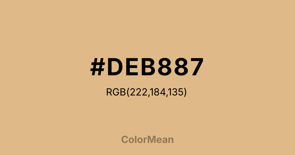 Burlywood (#DEB887) RGB value is (222, 184, 135). The hex color red value is 222, green is 184, and blue is 135. Its HSL format shows a hue of 34°, saturation of 57%, and lightness of 70%. The CMYK process values are 0%, 17%, 39%, 13%.