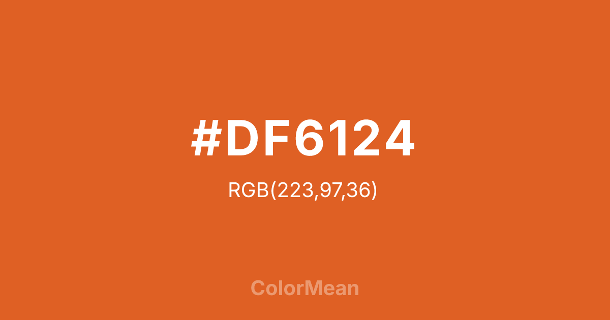 Vivid Red Tangelo (#DF6124) RGB value is (223, 97, 36). The hex color red value is 223, green is 97, and blue is 36. Its HSL format shows a hue of 20°, saturation of 75%, and lightness of 51%. The CMYK process values are 0%, 57%, 84%, 13%.