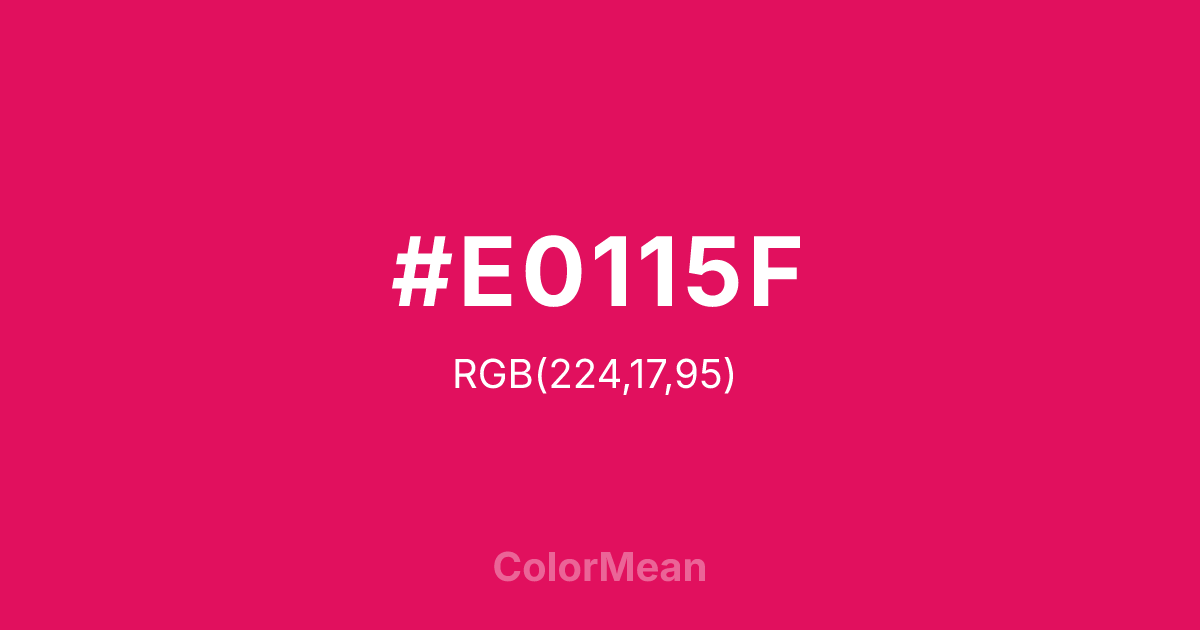 Ruby (#E0115F) RGB value is (224, 17, 95). The hex color red value is 224, green is 17, and blue is 95. Its HSL format shows a hue of 337°, saturation of 86%, and lightness of 47%. The CMYK process values are 0%, 92%, 58%, 12%.