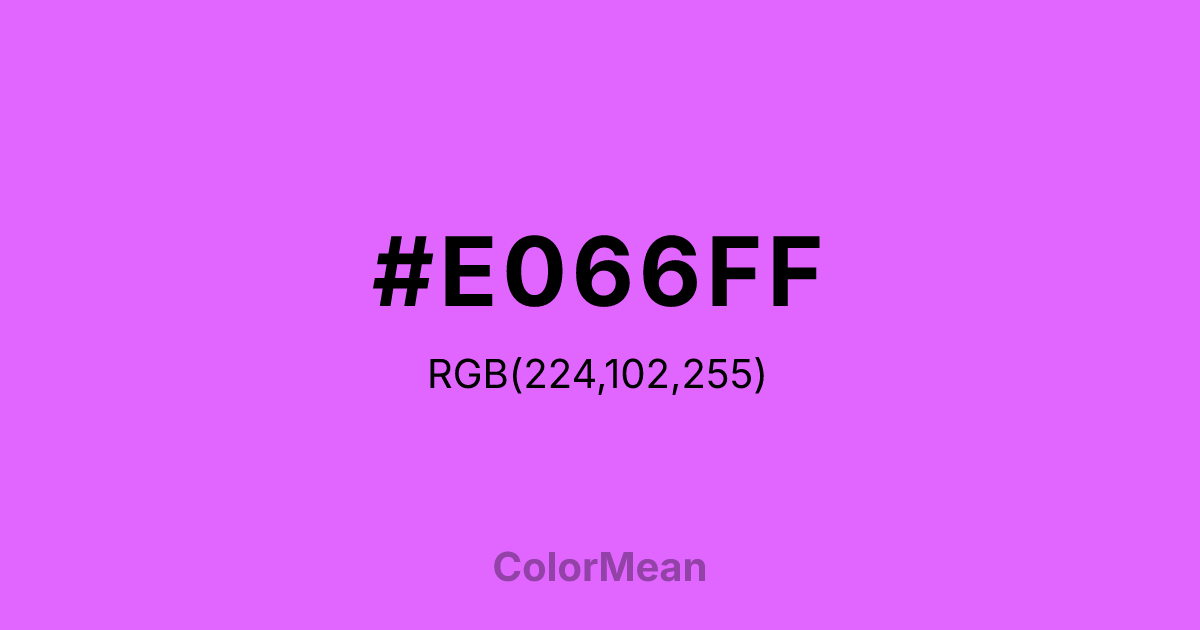 MediumOrchid1 (#E066FF) RGB value is (224, 102, 255). The hex color red value is 224, green is 102, and blue is 255. Its HSL format shows a hue of 288°, saturation of 100%, and lightness of 70%. The CMYK process values are 12%, 60%, 0%, 0%.