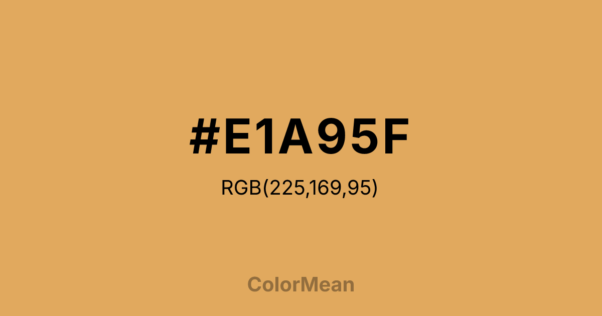 Earth Yellow (#E1A95F) RGB value is (225, 169, 95). The hex color red value is 225, green is 169, and blue is 95. Its HSL format shows a hue of 34°, saturation of 68%, and lightness of 63%. The CMYK process values are 0%, 25%, 58%, 12%.