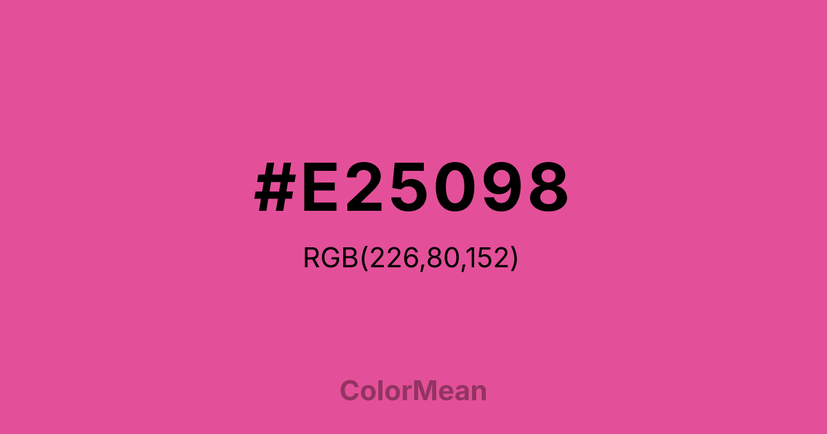 Raspberry Pink (#E25098) RGB value is (226, 80, 152). The hex color red value is 226, green is 80, and blue is 152. Its HSL format shows a hue of 330°, saturation of 72%, and lightness of 60%. The CMYK process values are 0%, 65%, 33%, 11%.
