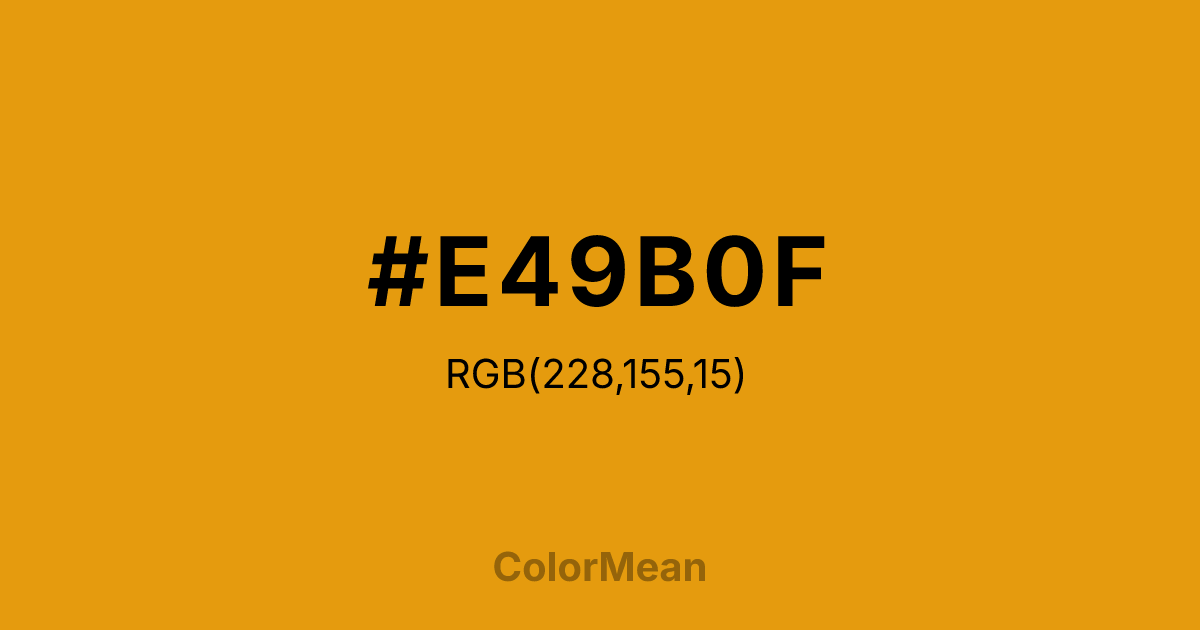 Gamboge (#E49B0F) RGB value is (228, 155, 15). The hex color red value is 228, green is 155, and blue is 15. Its HSL format shows a hue of 39°, saturation of 88%, and lightness of 48%. The CMYK process values are 0%, 32%, 93%, 11%.