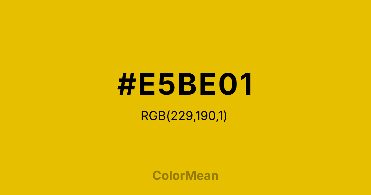 Signal Yellow (#E5BE01) RGB value is (229, 190, 1). The hex color red value is 229, green is 190, and blue is 1. Its HSL format shows a hue of 50°, saturation of 99%, and lightness of 45%. The CMYK process values are 0%, 17%, 100%, 10%.