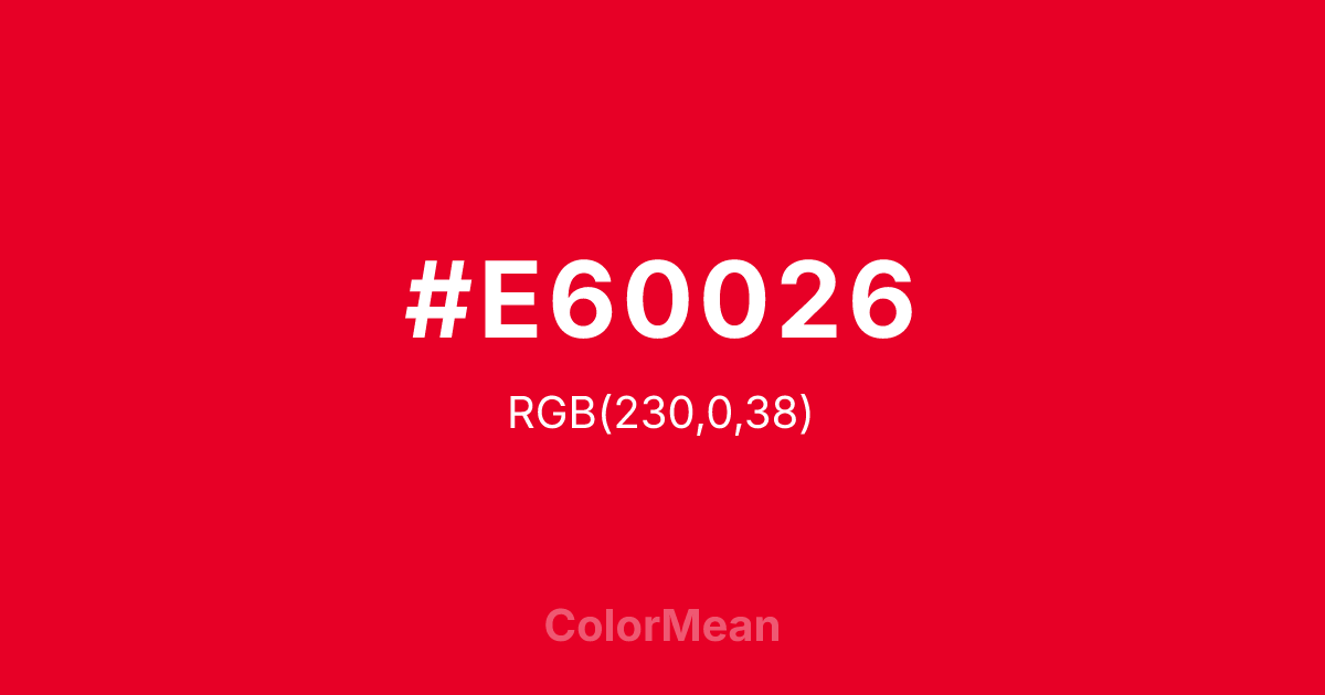 Spanish Red (#E60026) RGB value is (230, 0, 38). The hex color red value is 230, green is 0, and blue is 38. Its HSL format shows a hue of 350°, saturation of 100%, and lightness of 45%. The CMYK process values are 0%, 100%, 83%, 10%.