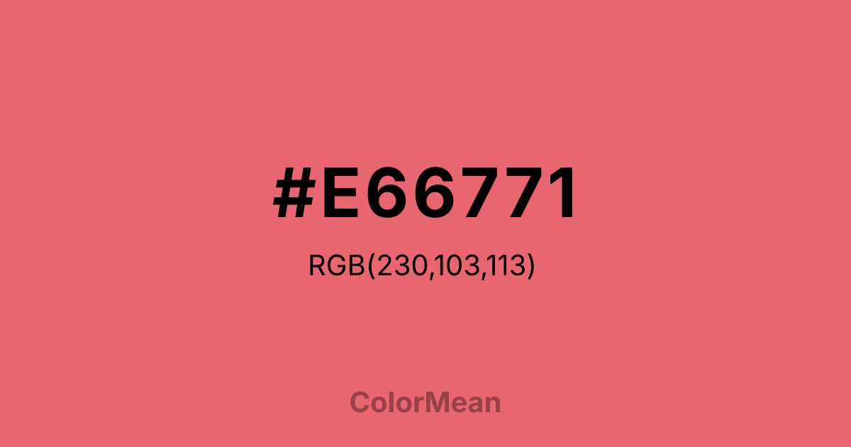 Light Carmine Pink (#E66771) RGB value is (230, 103, 113). The hex color red value is 230, green is 103, and blue is 113. Its HSL format shows a hue of 355°, saturation of 72%, and lightness of 65%. The CMYK process values are 0%, 55%, 51%, 10%.