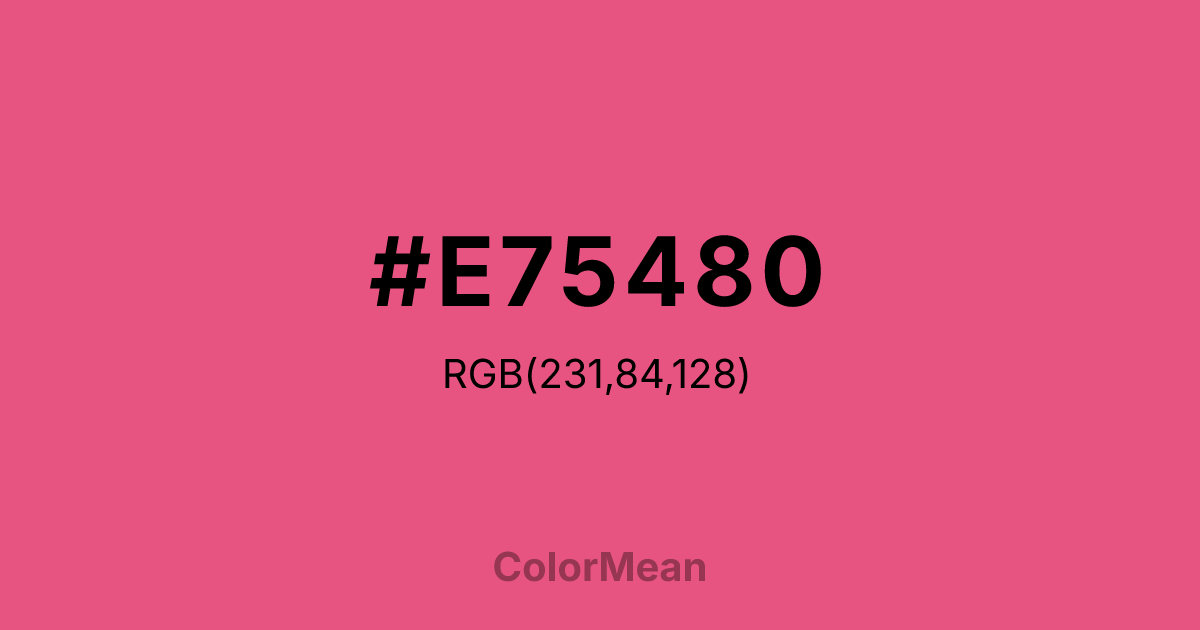 Dark Pink (#E75480) RGB value is (231, 84, 128). The hex color red value is 231, green is 84, and blue is 128. Its HSL format shows a hue of 342°, saturation of 75%, and lightness of 62%. The CMYK process values are 0%, 64%, 45%, 9%.