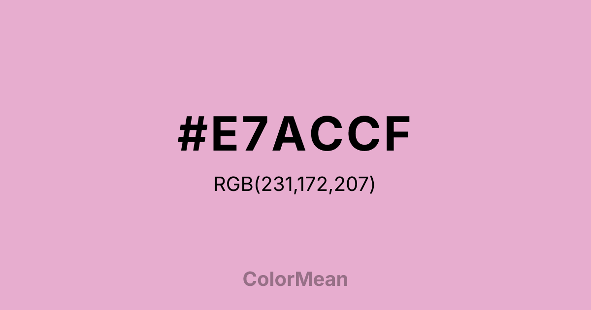 Pink Pearl (#E7ACCF) RGB value is (231, 172, 207). The hex color red value is 231, green is 172, and blue is 207. Its HSL format shows a hue of 324°, saturation of 55%, and lightness of 79%. The CMYK process values are 0%, 26%, 10%, 9%.