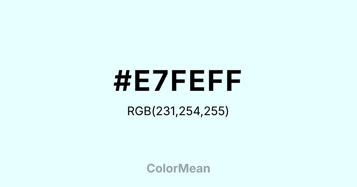 Bubbles (#E7FEFF) RGB value is (231, 254, 255). The hex color red value is 231, green is 254, and blue is 255. Its HSL format shows a hue of 183°, saturation of 100%, and lightness of 95%. The CMYK process values are 9%, 0%, 0%, 0%.