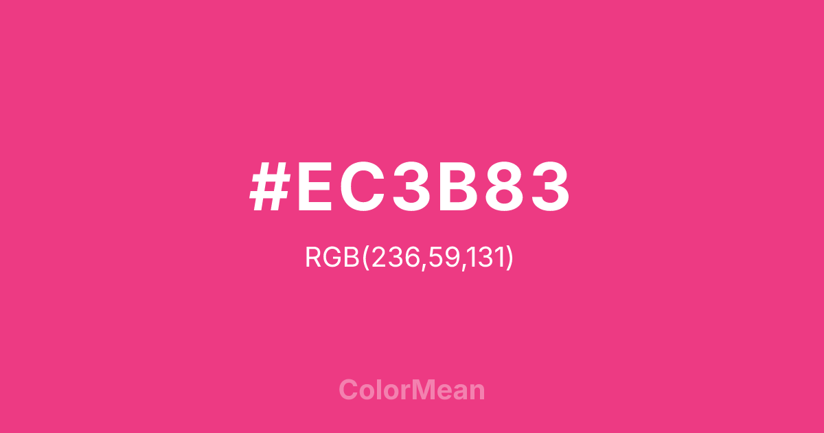Cerise Pink (#EC3B83) RGB value is (236, 59, 131). The hex color red value is 236, green is 59, and blue is 131. Its HSL format shows a hue of 336°, saturation of 82%, and lightness of 58%. The CMYK process values are 0%, 75%, 44%, 7%.