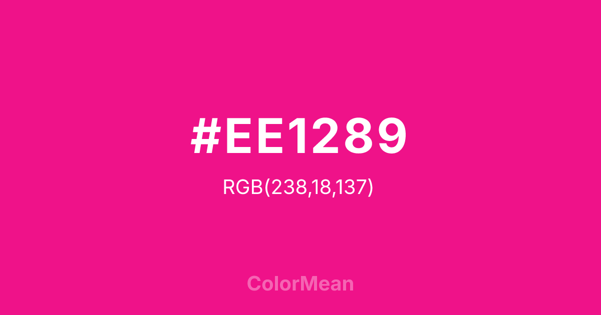 DeepPink2 (#EE1289) RGB value is (238, 18, 137). The hex color red value is 238, green is 18, and blue is 137. Its HSL format shows a hue of 328°, saturation of 87%, and lightness of 50%. The CMYK process values are 0%, 92%, 42%, 7%.