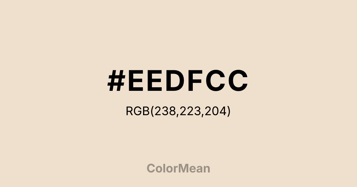 AntiqueWhite2 (#EEDFCC) RGB value is (238, 223, 204). The hex color red value is 238, green is 223, and blue is 204. Its HSL format shows a hue of 34°, saturation of 50%, and lightness of 87%. The CMYK process values are 0%, 6%, 14%, 7%.