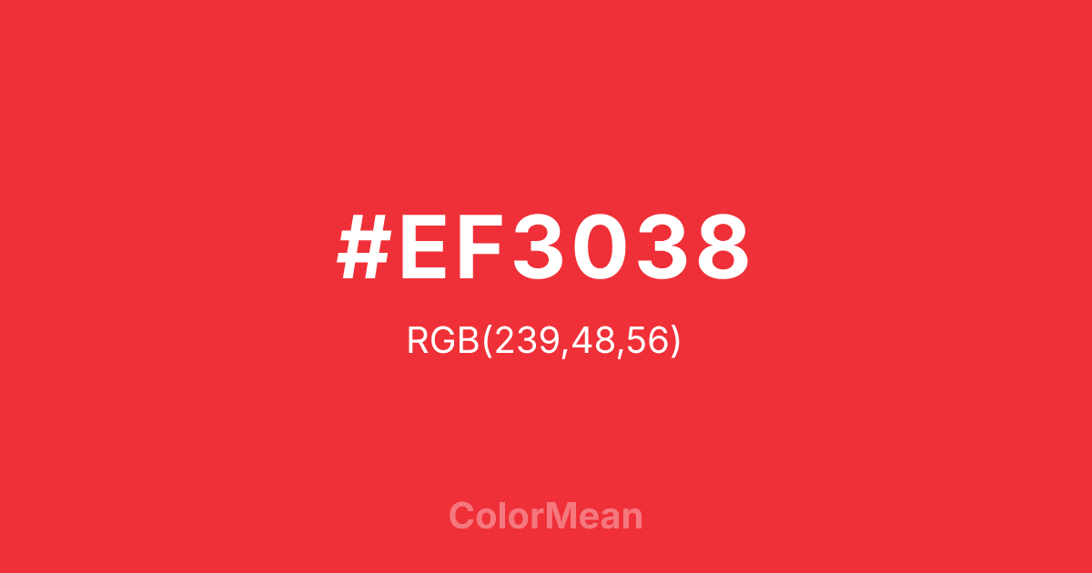 Deep Carmine Pink (#EF3038) RGB value is (239, 48, 56). The hex color red value is 239, green is 48, and blue is 56. Its HSL format shows a hue of 357°, saturation of 86%, and lightness of 56%. The CMYK process values are 0%, 80%, 77%, 6%.