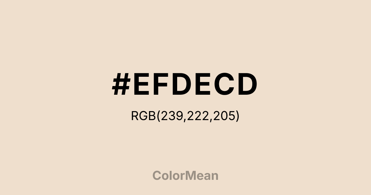Almond (#EFDECD) RGB value is (239, 222, 205). The hex color red value is 239, green is 222, and blue is 205. Its HSL format shows a hue of 30°, saturation of 52%, and lightness of 87%. The CMYK process values are 0%, 7%, 14%, 6%.