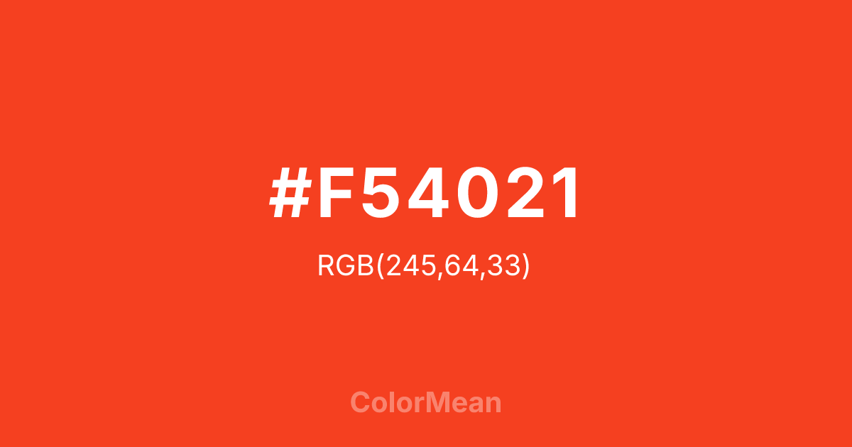 Traffic Orange (#F54021) RGB value is (245, 64, 33). The hex color red value is 245, green is 64, and blue is 33. Its HSL format shows a hue of 9°, saturation of 91%, and lightness of 55%. The CMYK process values are 0%, 74%, 87%, 4%.