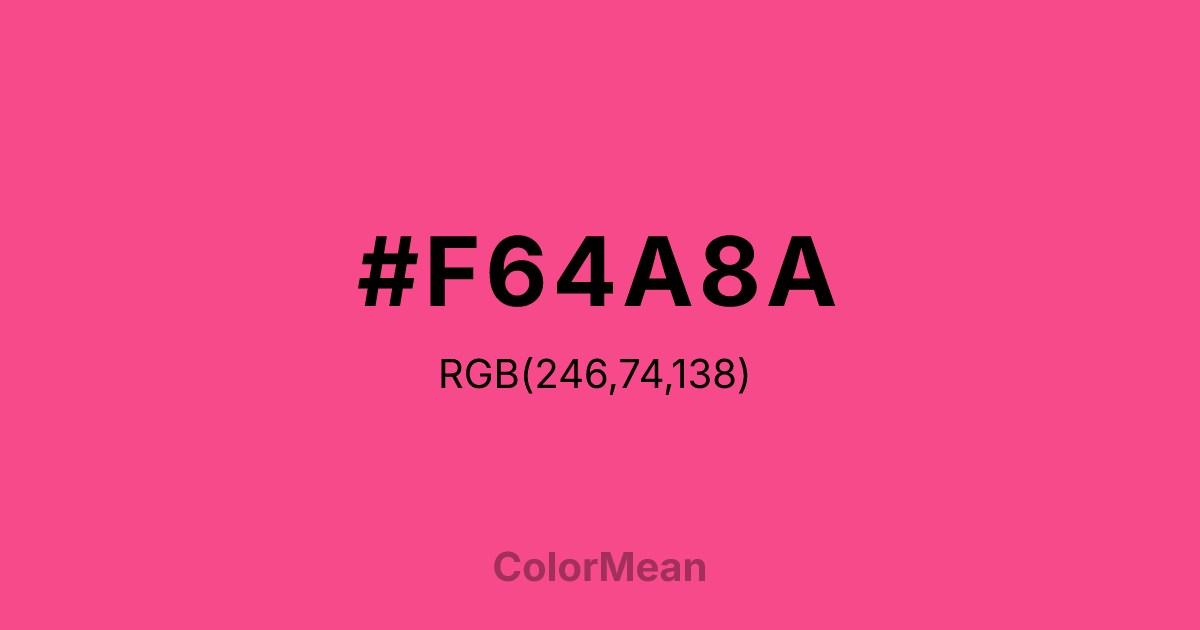 French Rose (#F64A8A) RGB value is (246, 74, 138). The hex color red value is 246, green is 74, and blue is 138. Its HSL format shows a hue of 338°, saturation of 91%, and lightness of 63%. The CMYK process values are 0%, 70%, 44%, 4%.