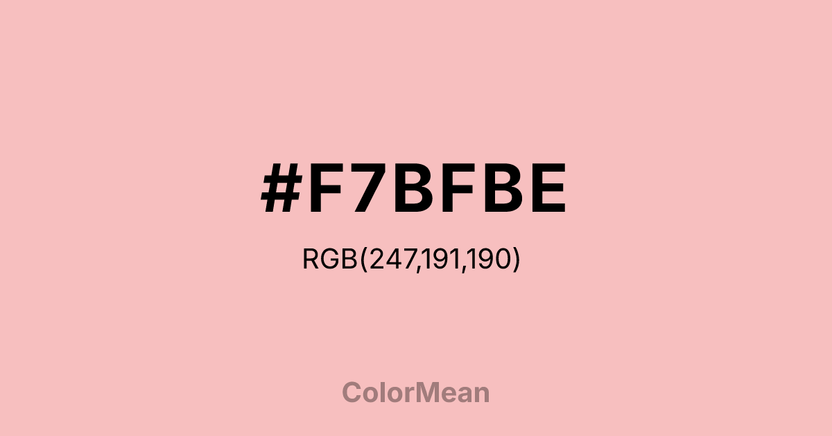 Spanish Pink (#F7BFBE) RGB value is (247, 191, 190). The hex color red value is 247, green is 191, and blue is 190. Its HSL format shows a hue of 1°, saturation of 78%, and lightness of 86%. The CMYK process values are 0%, 23%, 23%, 3%.