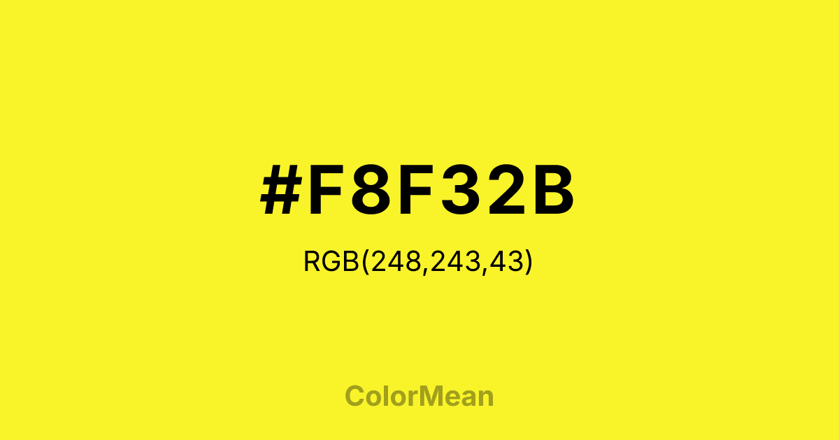 Zinc Yellow (#F8F32B) RGB value is (248, 243, 43). The hex color red value is 248, green is 243, and blue is 43. Its HSL format shows a hue of 59°, saturation of 94%, and lightness of 57%. The CMYK process values are 0%, 2%, 83%, 3%.