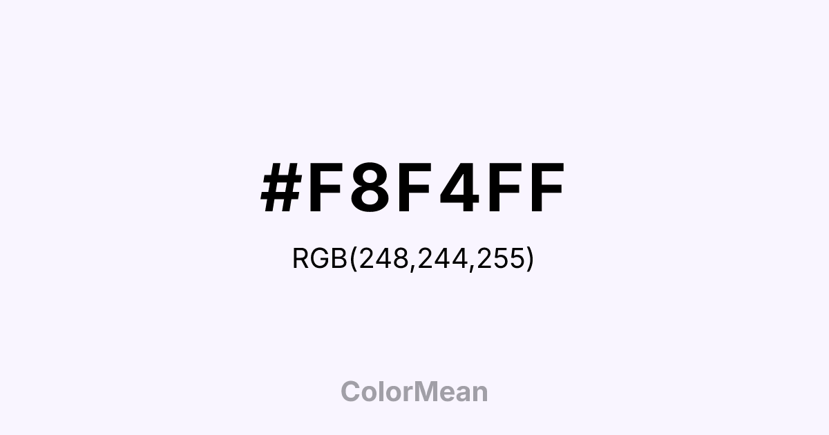 Magnolia (#F8F4FF) RGB value is (248, 244, 255). The hex color red value is 248, green is 244, and blue is 255. Its HSL format shows a hue of 262°, saturation of 100%, and lightness of 98%. The CMYK process values are 3%, 4%, 0%, 0%.