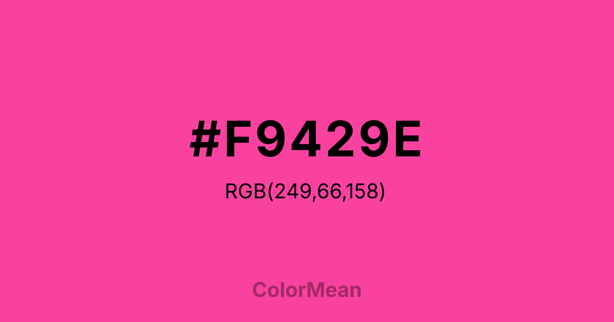 Rose Bonbon (#F9429E) RGB value is (249, 66, 158). The hex color red value is 249, green is 66, and blue is 158. Its HSL format shows a hue of 330°, saturation of 94%, and lightness of 62%. The CMYK process values are 0%, 73%, 37%, 2%.