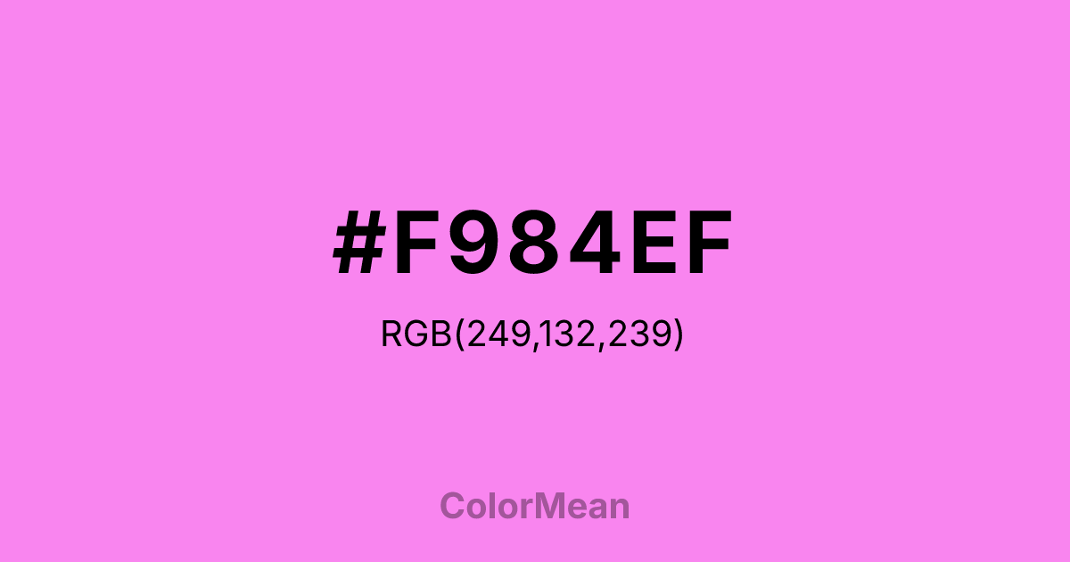 Light Fuchsia Pink (#F984EF) RGB value is (249, 132, 239). The hex color red value is 249, green is 132, and blue is 239. Its HSL format shows a hue of 305°, saturation of 91%, and lightness of 75%. The CMYK process values are 0%, 47%, 4%, 2%.