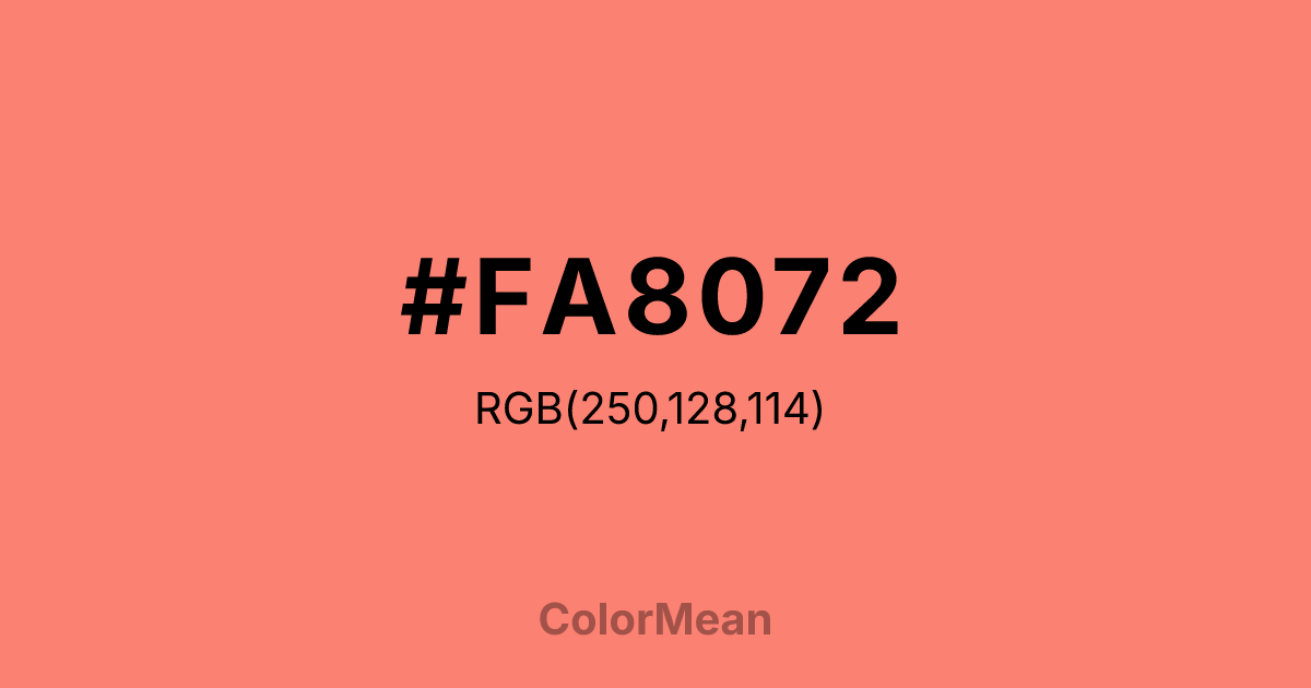 Salmon (#FA8072) RGB value is (250, 128, 114). The hex color red value is 250, green is 128, and blue is 114. Its HSL format shows a hue of 6°, saturation of 93%, and lightness of 71%. The CMYK process values are 0%, 49%, 54%, 2%.