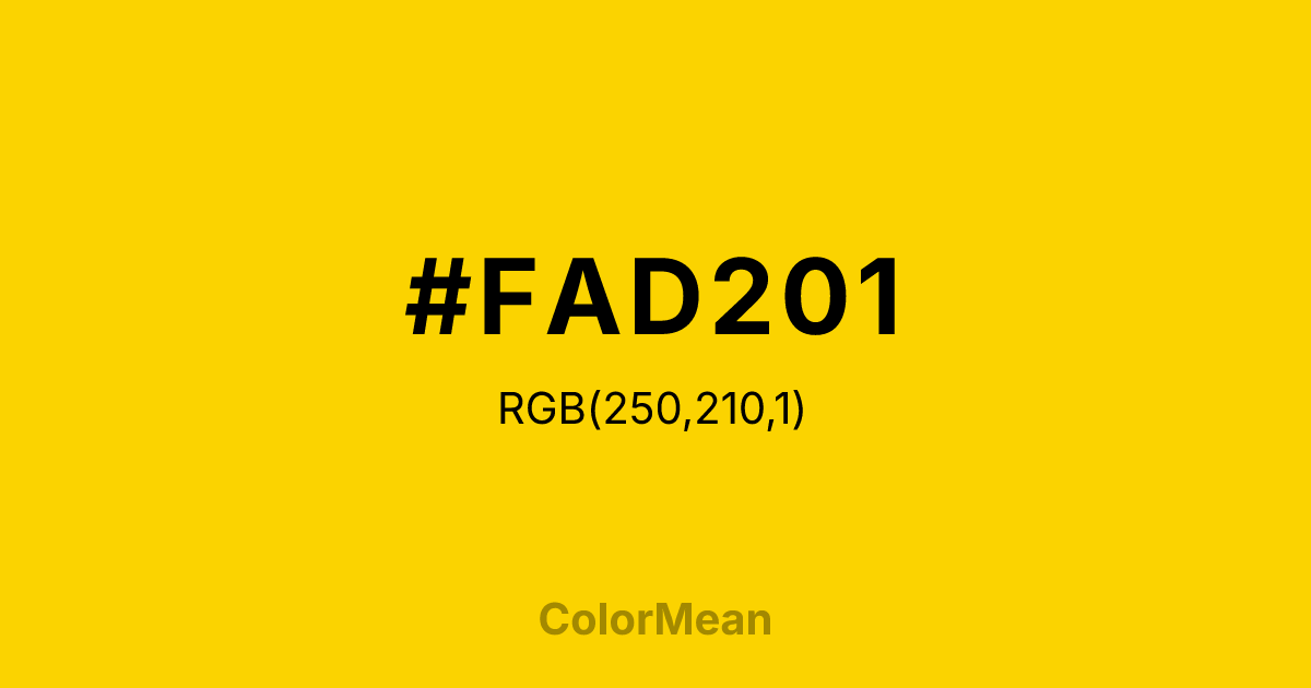 Traffic Yellow (#FAD201) RGB value is (250, 210, 1). The hex color red value is 250, green is 210, and blue is 1. Its HSL format shows a hue of 50°, saturation of 99%, and lightness of 49%. The CMYK process values are 0%, 16%, 100%, 2%.