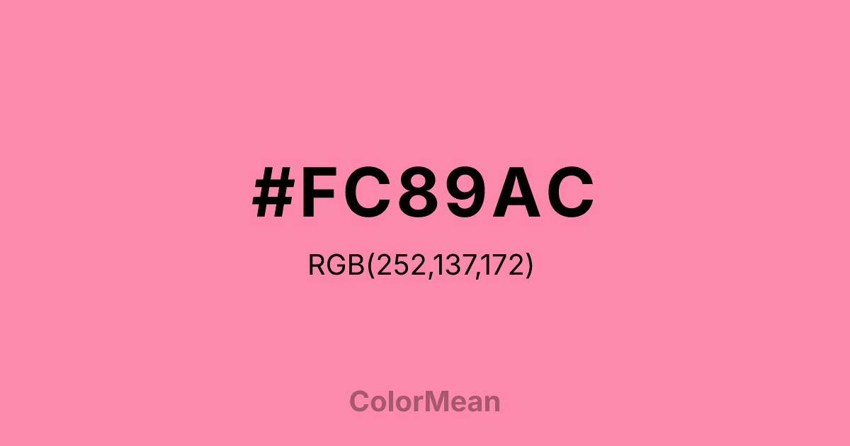 Tickle Me Pink (#FC89AC) RGB value is (252, 137, 172). The hex color red value is 252, green is 137, and blue is 172. Its HSL format shows a hue of 342°, saturation of 95%, and lightness of 76%. The CMYK process values are 0%, 46%, 32%, 1%.